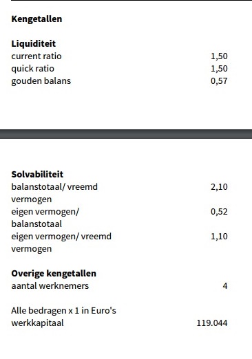 De ratio’s van Denkers ICT lijken op basis van de beschikbare cijfers heel goed. De current ratio, de verhouding tussen de kortlopende vorderingen en de kortlopende schulden, komt in 2014 uit op 1,50. Simpel gezegd betekent dit, dat als het bedrijf al haar direct opeisbare schulden aflost met haar direct opeisbare vorderingen, zij van de vorderingen een derde overhoudt. Het werkkapitaal is in 2014 positief. De uitkomst van 119.044 euro betekent dat er ruim een ton overblijft als de kortlopende schulden en de kortlopende vorderingen met liquide middelen tegen elkaar worden weggestreept.