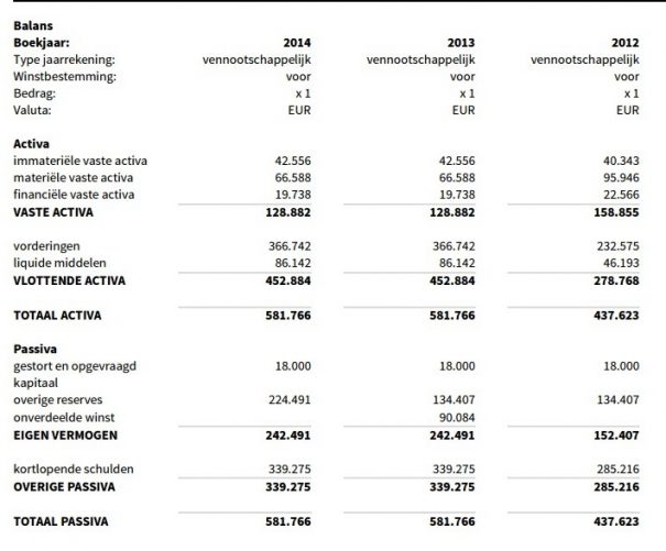 Toch lijkt er in dit geval iets anders aan de hand te zijn. In 2013 zien we namelijk nog iets meer dan 90.000 euro aan onverdeelde winst op de balans staan. In 2014 is deze post toegevoegd aan de overige reserves. Het lijkt er op dat de balans om een niet duidelijke reden bevroren is. Een andere reden kan zijn dat er een heel uitzonderlijk jaar is geweest, waarbij exact evenveel is geïnvesteerd als er is afgeschreven, er evenveel cash geld is binnengekomen als er is uitgegaan en waarbij er of een exact nul-resultaat is gedraaid of de winst volledig is uitgekeerd aan de aandeelhouder(s).