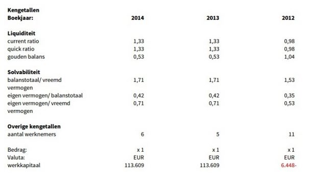 Positief is wel om te zien dat het bedrijf niet wordt leeggetrokken. De verhoudingen in de balans zijn prima en er is nog altijd voldoende eigen vermogen aanwezig om van een gezonde balans te spreken. Als we de toelichting op de jaarcijfers er op naslaan, zien we dat er in 2014 nog steeds sprake is van 6,1 fte personeel. Dit lijkt een mogelijk vermoeden dat de activiteiten in een andere B.V. zijn ondergebracht naar het land der fabelen te sturen.