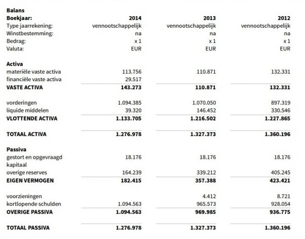 Wanneer we de activakant van de balans bekijken, dan zien we de eerste tekenen van een, zoals economen dat noemen, een consoliderend bedrijf. Er zijn geen grote stijgingen in balansposten, wat lijkt aan te geven dat er geen grote groei meer in het bedrijf zit. Wat wel opvalt is de post liquide middelen. Deze loopt in de drie bekeken jaren met rasse schreden terug. Waar er in 2012 nog een kleine 3,5 ton aan cash middelen in het bedrijf zat, is dit in 2014 teruggelopen tot iets minder dan 40.000 euro.