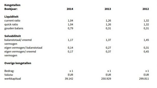 Aan de passivakant van de balans zien we een aantal zaken die geen heel positief beeld lijken te scheppen. De eerste daarvan is de post kortlopende schulden. Deze neemt jaarlijks toe en stijgt in de drie bekeken jaren met bijna 1,5 ton. Nu hoeft dit op zichzelf geen negatief signaal te zijn. Het gebeurt namelijk vaak dat vooruitbetaalde abonnementen worden geboekt als kortlopende schuld, omdat zij voor een deel betrekking hebben op het volgend jaar. Dit zou dus ook een teken van stijgende omzet kunnen zijn. Pakken we hier de reserves bij, dan lijkt deze optie een stuk minder realistisch. In 2013 lopen de reserves terug met zo’n 70.000 euro en in 2014 is deze daling bijna 175.000 euro. Dit lijkt een indicatie dat er, in ieder geval in 2013 en 2014, verlies is gemaakt en dat deze groter wordt.