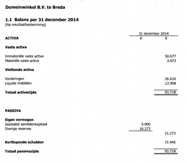 Het eerste dat opvalt aan de balans is het feit dat er geen heel grote bedragen op te zien zijn. Dit lijkt aan te geven dat Domeinwinkel geen heel grote speler in de markt is. Wel zijn er een aantal dingen die mogelijk verklaren waarom er maar 1 reeks cijfers te zien is. De belangrijkste hiervan is het geplaatst aandelenkapitaal. Dit is namelijk 5.000 euro. Dit lijkt aan te geven dat de B.V. is opgericht ná 2012. Voor die tijd was het namelijk verplicht een minimaal aandelenkapitaal te hebben van 18.000 euro. Ook is er een post immateriële vaste activa die meer dan de helft van de balans beslaat. Dit alles lijkt te wijzen op een wijziging van eenmanszaak of v.o.f. naar B.V. in 2014.