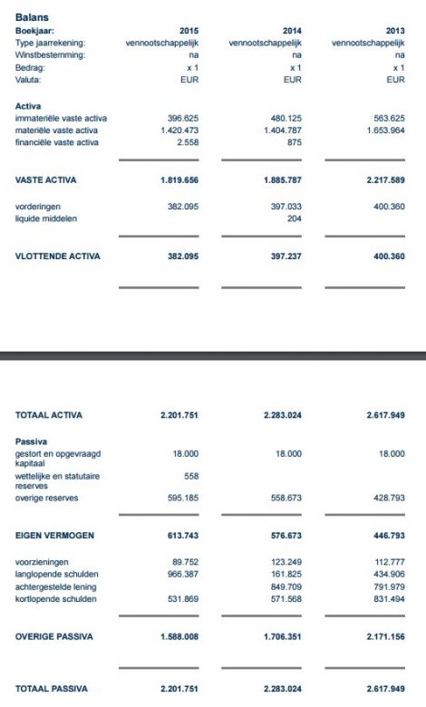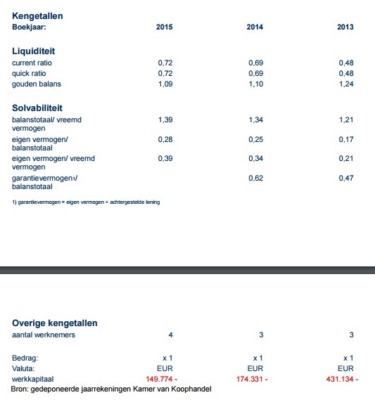 Aan de andere kant van de balans zien we een achtergestelde lening die ogenschijnlijk in 2015 is omgezet in een reguliere lening. Gelet op het feit dat de totale schuldenlast met ongeveer een ton per jaar terug loopt is dit geen probleem. Ook lijkt het er op dat er een weliswaar bescheiden winst wordt gemaakt (in ieder geval in 2015), maar dat er in ieder geval jaarlijks winst is. In de drie bekeken jaren stijgen de reserves van iets meer dan 4 ton in 2013 naar bijna 6 ton in 2015.