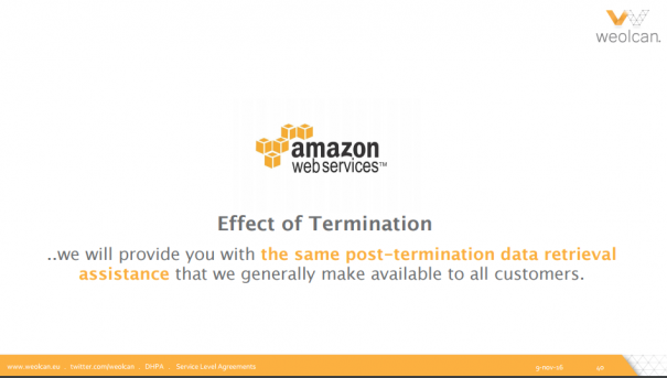 Intussen heb ik zelf ook even gekeken in de voorwaarden van Amazon AWS en wat staat er in de zin onder die bepaling: “Any additional post-termination assistance from us is subject to mutual agreement by you and us”. Dus Amazon AWS geeft zelfs expliciet aan dat als je méér wilt, dat je dan afspraken met ze moet maken. Of dat (feitelijk) mogelijk is, is een tweede, maar serieus dit komt op mij over als (bewust) selectief citeren. Een dikke onvoldoende voor Weolcan!!