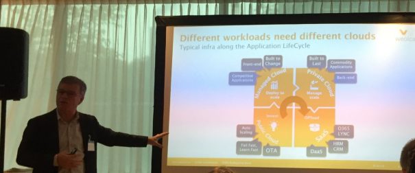 De presentatie van Michiel de van der Schueren van Weolcan over cloud strategy was ook interessant. Waar die feitelijk op neerkomt, is dat je bij cloud/hosting een mix heb tussen mission critical en non-mission critical appplicaties en competitieve en commodity applicaties. Bij innovatie begin je met een nieuwe dienst die niet mission critical is maar wel competitief, dat wordt mission critical, op een gegeven moment is het nieuwe en daarmee het competitieve er ook vanaf en ben je meer met het onderhouden (managen) en uiteindelijk is een applicatie ook niet meer mission critical. Bij elk stap in dat (innovatie)proces past ook een ander soort hosting. In het plaatje hieronder is dat goed weergeven. De kunst is volgens Van der Schueren om je applicatie zo snel mogelijk door dat proces heen te loodsen om je aandacht bij het innoveren met nieuwe applicaties te kunnen houden.