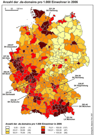 DENIC heeft een mooi kaartje online geplaatst waarin te zien is hoeveel .de-domeinnamen er gemiddeld per inwoner in Duitsland zijn geregistreerd. Wat duidelijk op het kaartje te zien is dat in de meer ontwikkelde, rijkere delen van Duitsland er relatief meer .de-domeinnamen per inwoner zijn geregistreerd dan in de rest van Duitsland.