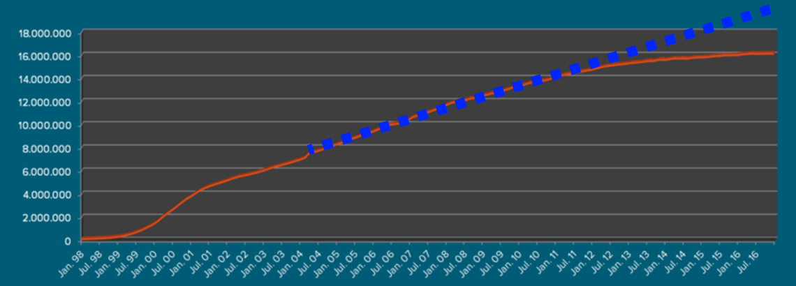 In een artikel op de eigen website schrijft Michiel Henneke van SIDN dat 2016 een goed jaar voor .nl was. De nettogroei van het .nl-domein is vorig jaar namelijk na vier jaar weer licht toegenomen. Dat klinkt positief. Echter is er ook in 2016 niks veranderd aan het feit dat de nettogroei van het .nl-domein al sinds 2013 gestagneerd is.