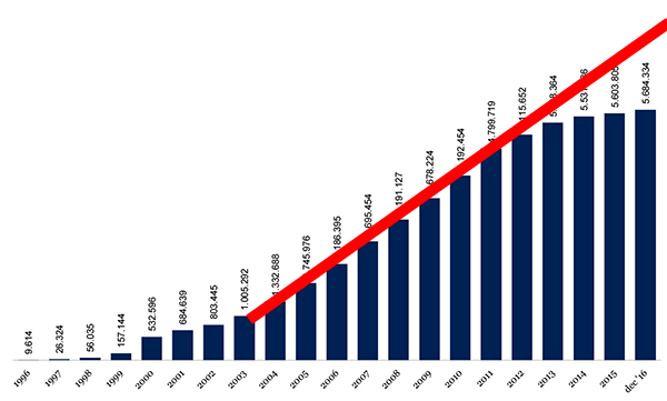 In 2016 kwamen er netto 80.529 .nl-domeinnamen bij. Dat is het resultaat van 830.000 nieuwe registraties, 770.000 opgeheven domeinnamen en 20.000 domeinnamen die ná opheffing weer uit quarantaine werden gehaald. Totaal waren er in december 2016 5,68 miljoen .nl-domeinnamen actief.