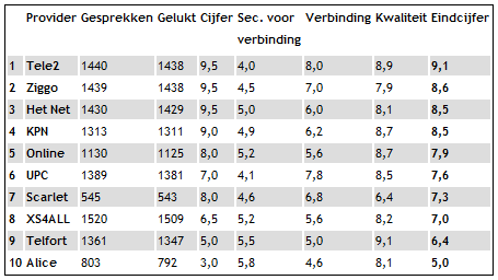 In de volgende tabel die door het Algemeen Dagblad is gepubliceerd, staan alle resultaten van het onderzoek naar de VoIP-providers op een rijtje:
