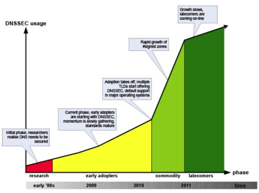 SURFnet verwacht dat DNSSEC pas in 2010 gemeengoed wordt. Het zal volgens SURFnet waarschijnlijk ook tot dan duren voor dat de DNS rootzone gesigneerd wordt. Tot dat het geval is moet elke DNS-server die DNSSEC ondersteunt van elke individuele TLD de sleutel bijhouden. Veel registraties wachten met de uitrol van DNSSEC tot de rootzone gesigneerd is, omdat ze dan niet langer zelf hun cryptografische sleutel hoeven te verspreiden. Het feit dat de rootzone nog niet gesigneerd is vertraagt de uitrol van DNSSEC daarom significant.
