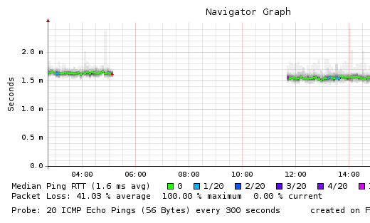 Kdiss.nl zelf was ook tot 11:00 uur de volgende morgen down zo blijkt uit bovenstaande smokeping statistiek, voor klanten begon de migratie overigens al om 23:00 uur en was de downtime hoogstwaarschijnlijk tenminste 12 uur, maar veelal veel langer!