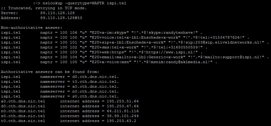 .tel-domeinen werken anders dan andere domeinen. Een .tel-domein kan enkel worden gebruikt om contactgegevens op te slaan via de hosting-dienst die aan het domein is gekoppeld. Kijk bijvoorbeeld naar het .tel-domein van collega Randy ten Have. Hij heeft ispi.tel geregistreerd, de contactgegevens zijn zowel door het bezoeken van ispi.tel te bekijken als via een DNS lookup in de vorm van NAPTR-records: