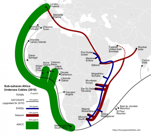 In Afrika zijn telecombedrijven druk bezig met de aanleg van de SEACOM fiber die Oost Afrika moet verbinden met India en Europa. Oost-Afrika heeft een enorme groei in de vraag naar internetverbindingen, de gebruikers aantallen stegen tussen 2000 en 2008 met 1.062 procent.