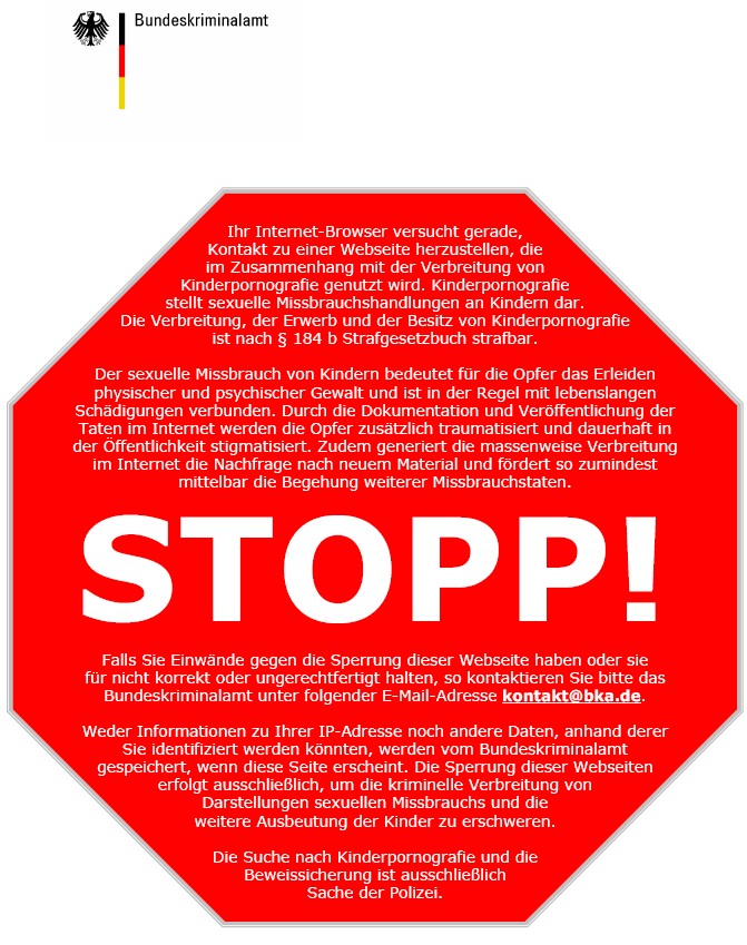 Net als vrijwel alle initiatieven om kinderporno te blokkeren gaat het ook in Duitsland werken op basis van de DNS. De Duitse federale politie Bundeskriminalambt (BKA) zal de lijst samenstellen. Hiervoor denkt BKA vier tot zes nieuwe medewerkers voor aan te moeten trekken. In Duitsland is er ook protest tegen het blokkeren van kinderporno websites. De grootste vereniging van computer gebruikers in Duitsland de Chaos Computer Club (CCC) is fel tegen de overeenkomst en noemt het censuur. CCC roept klanten van de vijf providers die de overeenkomst getekend hebben op om te protesteren bij hun provider.