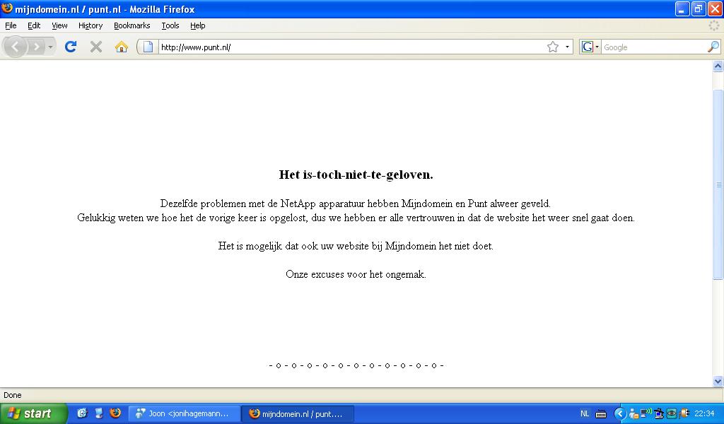 Maandagavond trad eenzelfde storing op zo was te lezen uit een catch-all pagina die alle bezoekers van punt.nl-blogs te zien kregen.