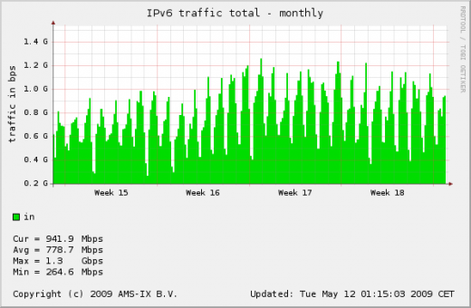 Er gaat nog weinig IPv6 verkeer over de Amsterdam Internet Exchange (AMS-IX). Momenteel piekt de teller op ongeveer 1,2 Gbit per dag. Op een totaal van ruim 600 Gbit aan verkeer dat uitgewisseld wordt is dit nog maar 0,2% van het totaal. De groei van het verkeer blijft doorzetten, hetzij met wisselende werking. Initiatieven van XS4ALL om een dual stack IPv4 en IPv6 DSL-verbinding te testen leveren een bijdrage aan die de groei.
