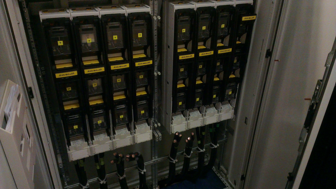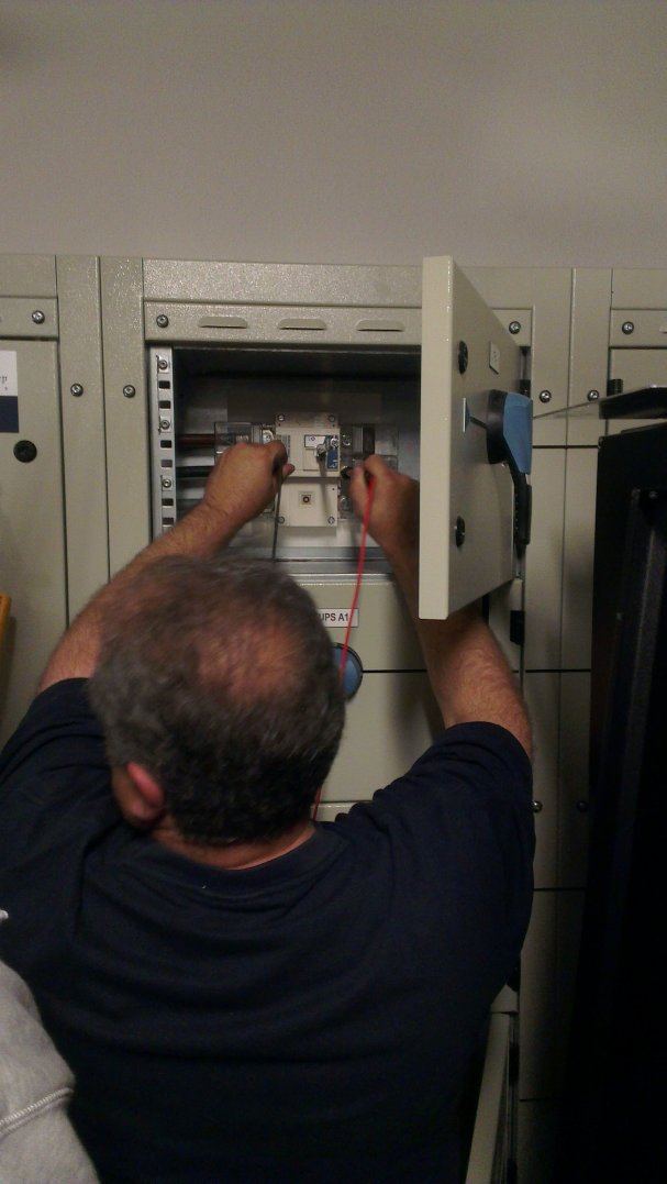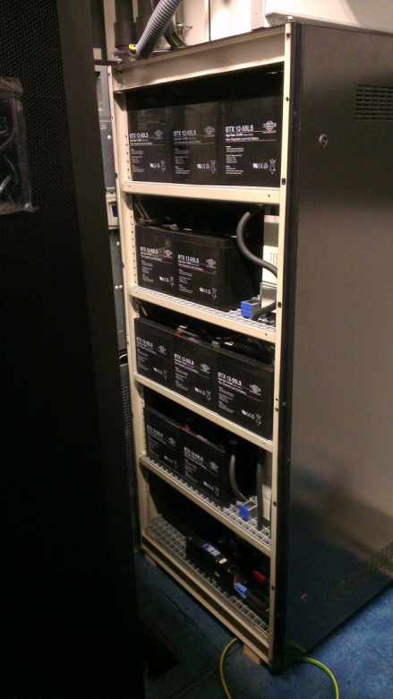 Afgelopen juni was de A-feed aan de beurt, in augustus de B-feed. Nieuwe UPS-en. Een Uninterruptable Power Supply, UPS, is in wezen een hele grote batterij. UPS-en voeden de apparatuur tussen het moment dat het lichtnet wegens storing niet beschikbaar is tot het moment dat de dieselaggregaten automatisch opgestart zijn en stroom leveren.