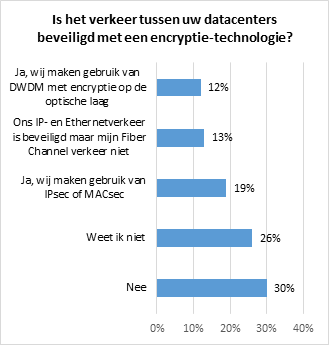 Voor veel IT-professionals is het nog onbekend dat glasvezelverbindingen eenvoudig kunnen worden afgetapt, waardoor data ontvreemd wordt. Meer dan de helft (56%) geeft aan dat het dataverkeer niet versleuteld is of heeft hier geen idee van. 44 procent van de IT-professionals heeft het dataverkeer al wel voorzien van een encryptie-technologie, waarvan 12 procent het fiber channel verkeer niet heeft beveiligd. Slechts 13 procent maakt daadwerkelijk gebruik van Dense Wavelength Division Multiplexing (DWDM) met encryptie op de optische laag. Encrypted DWDM is een technologie dat al het dataverkeer dat het pand verlaat versleutelt door middel van één oplossing.