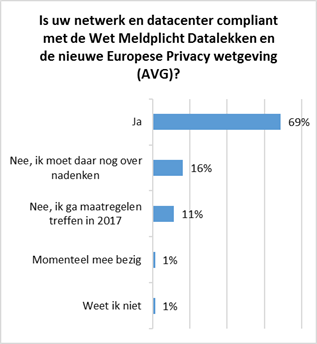 Op de vraag of het netwerk en datacenter al compliant zijn met de Wet Meldplicht Datalekken en de nieuwe Europese Privacy wetgeving, antwoordt 69 procent van de Nederlandse IT-professionals: “Ja”. Dezelfde respondenten geven echter aan dat zij dataverkeer tussen datacenters niet versleutelen (30%), of niet weten dat dit gebeurt (26%). Om aan de nationale wetgeving en de AVG te voldoen, is het versleutelen van data door middel van encryptie noodzakelijk. Data wordt zo onleesbaar en onbruikbaar voor niet-geautoriseerde gebruikers.