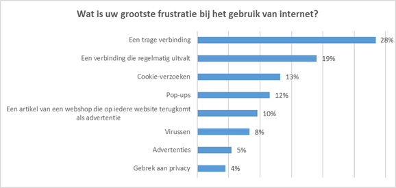 Opvallend is dat Nederlanders aangeven geen idee te hebben van privacybescherming op internet, maar dit blijkbaar ook niet als belangrijk ervaren. Slechts 4 procent ziet gebrek aan privacybescherming als een grote frustratie bij het gebruik van internet. Trage en slechte werking van de internetverbinding wordt door het merendeel (47%) als grootste frustratie aangekaart.