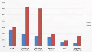 Uit het onderzoek blijkt dat het gebruik van cloudapplicaties in bepaalde segmenten enorm is toegenomen, met name in marketing- en salesautomatisering. In deze sectoren geeft respectievelijk 62 en 60 procent van de respondenten aan een cloudoplossing te gebruiken. Dit leidt weer tot het gebruik van steeds meer best-of-breed-applicaties. Het integreren van die cloudapplicaties is daarbij een van de belangrijkste uitdagingen, zo blijkt uit het onderzoek. Hierdoor neemt de vraag naar flexibele, nieuwe integratiemogelijkheden sterk toe. Maar liefst 61 procent van de ondervraagden geeft aan niet tevreden te zijn met zijn huidige integratie tussen diverse cloudoplossingen.