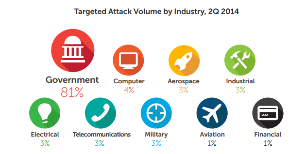 De overheid blijft ook in het tweede kwartaal van 2014 veruit het belangrijkste doelwit van cybercriminelen. Ruim 81 procent van de gerichte aanvallen richtte zich op overheidsinstanties in het tweede kwartaal van dit jaar. Dit is een stijging ten opzichte van het eerste kwartaal van dit jaar waarin 76 procent van de geavanceerde gerichte aanvallen (APT’s) was gericht op de overheid.