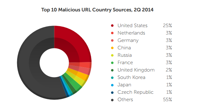 Het aantal malafide URL’s dat werd gehost in Nederland groeide van 24 miljoen in het eerste kwartaal van 2014, naar 31 miljoen in het tweede kwartaal. Dat is een groei van bijna 30 procent. In april verdubbelde het aantal gehoste malafide URL’s zelfs. Hiermee staat Nederland op een gedeelde tweede plaats van landen die malafide URL’s hosten.