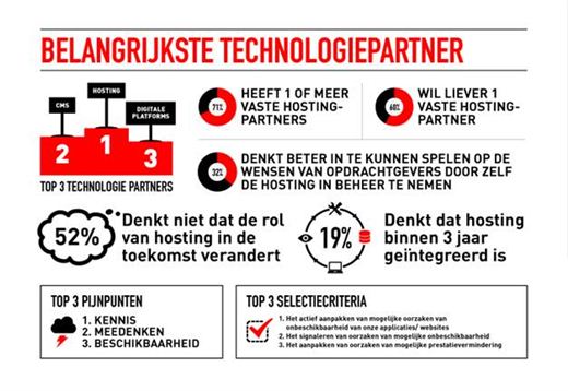 Uit het onderzoek blijkt dat hostingproviders de belangrijkste technologiepartners van Nederlandse webbureaus zijn. Vooral bij fullservice-bureaus is dat het geval (42%). Op de tweede en derde plaats volgen respectievelijk leveranciers van CMS-pakketten en aanbieders van wereldwijde digitale platforms, zoals Google en Microsoft. 71% van de webbureaus heeft een of meer vaste hostingpartners, 60% zegt het liefst met één hostingpartner samen te werken. Managed hosting is de populairste dienst die wordt afgenomen (59%), PaaS de minst populaire (23%).