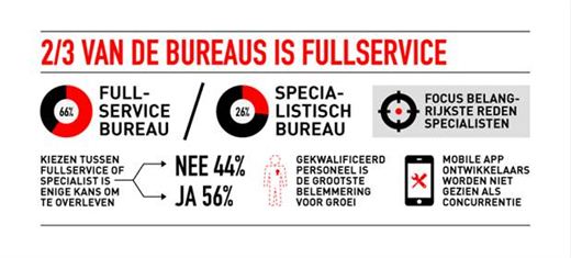 Het aantal webbureaus dat het predikaat ‘fullservice’ draagt, is de laatste jaren sterk gegroeid. Tweederde van de webbureaus ziet zichzelf inmiddels als fullservice-bureau, eenderde als gespecialiseerd bureau. Een fullservice-webbureau is een bureau dat ten minste twee van de volgende drie disciplines beheerst: strategie & concept, design & functioneel ontwerp en realisatie. Dé reden voor organisaties om zich geen fullservice-webbureau te noemen, is dat de focus op web- en applicatieontwikkeling ligt. 56% van de respondenten is van mening dat een duidelijke keuze voor specialisatie of fullservice de enige kans op overleving biedt binnen de sector.