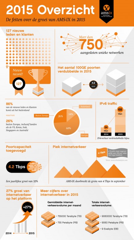 In 2015 groeide het totale internetverkeersvolume binnen AMS-IX met 27% van 7.1 naar 9 Exabytes (ruim 9 miljoen Terabytes). De groei van het volume heeft ook invloed op de capaciteit. Een voorbeeld van deze groei is de verdubbeling van het aantal poorten met een grotere capaciteit (100GE poorten). Bovendien zag AMS-IX het IPv61-verkeer in één jaar tijd bijna verdrievoudigen: van 24 Gigabits per seconde (Gbps) in 2014 tot 68 Gbps in 2015. Deze sterke groei toont aan dat onze klanten steeds vaker IPv6 implementeren in hun organisatie.