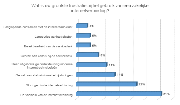 Uit online onderzoek van BIT, uitgevoerd onder 111 respondenten, blijkt dat bij zakelijke internetverbindingen de meeste frustratie voortkomt uit de snelheid hiervan. Maar liefst 31 procent van de respondenten heeft dit als grootste frustratie gemarkeerd. Hierna volgen storingen in de internetverbinding (22%) en gebrek aan statusinformatie bij storingen (14%). Daarentegen hebben respondenten aangegeven dat de bereikbaarheid van de servicedesk (5%), langdurige aanlegtrajecten (5%) en langlopende contracten met de internetaanbieder (4%) de minste frustratie opleveren.