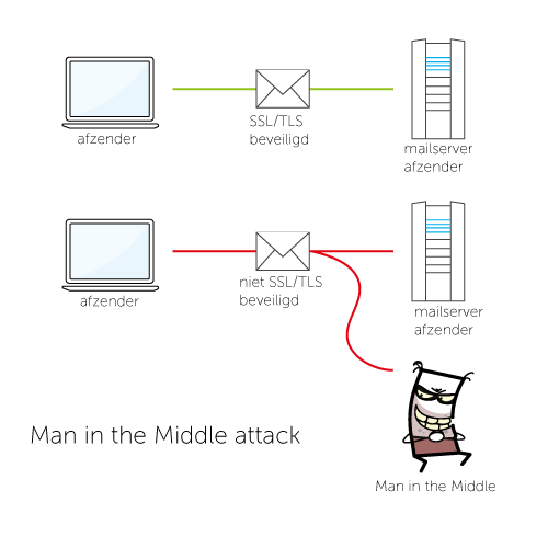 E-mailverkeer kan afgeluisterd worden door een zogenaamde Man in the Middle-attack, waarbij een derde partij zich tussen het verkeer van de zender en de mailserver in wringt en het bericht onderschept. Dit kan gebeuren wanneer het verkeer onversleuteld verloopt, of als de gebruikte versleuteling niet sterk genoeg is. Daarbij kan dit afluisteren van het mailverkeer op meerdere momenten gebeuren: tussen het verzenden vanuit de mailclient en de verzendende mailserver, tijdens het verzenden van de verzendende naar de ontvangende mailserver, of tijdens het doorsturen van de ontvangende mailserver naar de ontvangende mailclient.