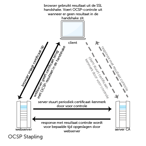 OCSP is wel de beste oplossing, maar had nog steeds meerdere problemen op het gebied van snelheid, veiligheid en stabiliteit. Dat is opgelost met OCSP Stapling. Bij OCSP Stapling wordt er regelmatig vanuit de server zelf een OCSP request gestuurd naar de CA. Vervolgens bevestigt (‘stapled’, oftewel ‘vastgemaakt met een nietje’) de server dit resultaat aan de SSL handshake die aangeroepen wordt als een gebruiker verbinding maakt met een website over HTTPS. Dit betekent dat er veel minder dataverkeer tussen de server en de browser nodig is, omdat het resultaat meegegeven wordt met de SSL verbinding, die toch al opgezet wordt bij elk bezoek. Omdat het resultaat ondertekend moet zijn door de CA, kan er geen misbruik gemaakt worden van dit systeem door frauduleuze resultaten mee te geven.