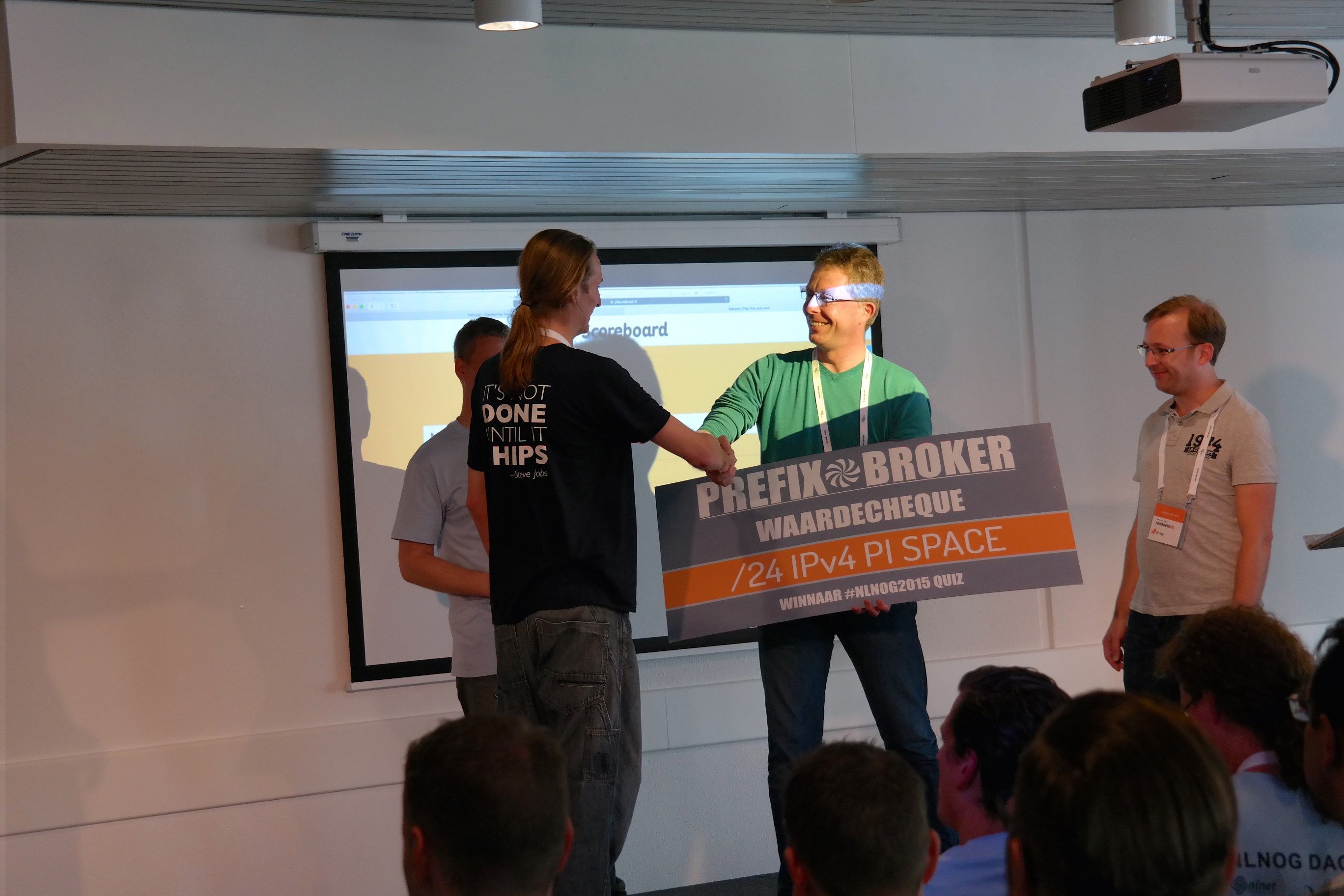 Ook dit jaar werd het programma weer afgesloten met de bekende NLNOG Quiz. Deze quiz, die slechts geschikt voor de echte hardcore netwerkmannen en -vrouwen, had dit jaar wel een zeer bijzondere hoofdprijs. Het bedrijf Prefix Broker stelde voor de winnaar van de hoofdprijs een IPv4 /24 ter beschikking! Na ruim 25 vragen, waaronder instinkers als “Welke attribute value representeert NO_EXPORT?”, werd de gelukkige winnaar gekozen. Bovendien hebben de sponsoren de community ook niet teleurgesteld. Behalve een eerste en tweede prijs, waren er ook 6 drones te winnen!